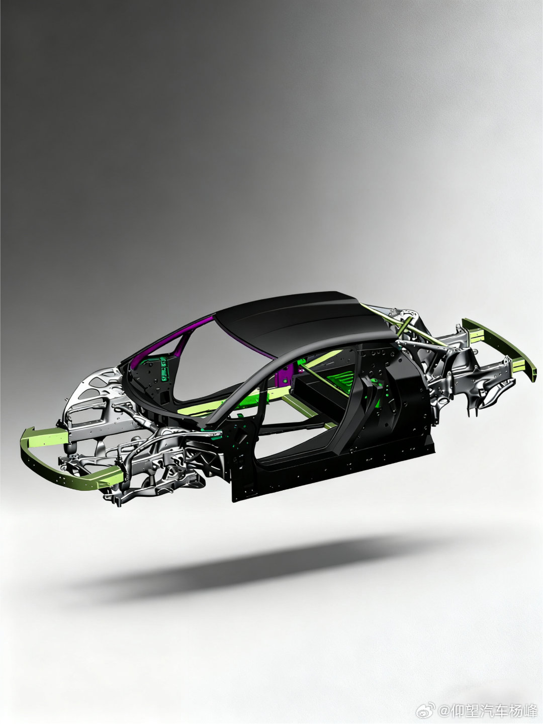 面对整车极限速度以及极致操控性的挑战,车身选择使用最先进的、最前沿的技术和材料去进行设计。3D 打印技术赋予车身高度的结构自由度与集成化,可实现车身超高的赛道级刚度、极致的碰撞安全以及行业领先的轻量化系数。