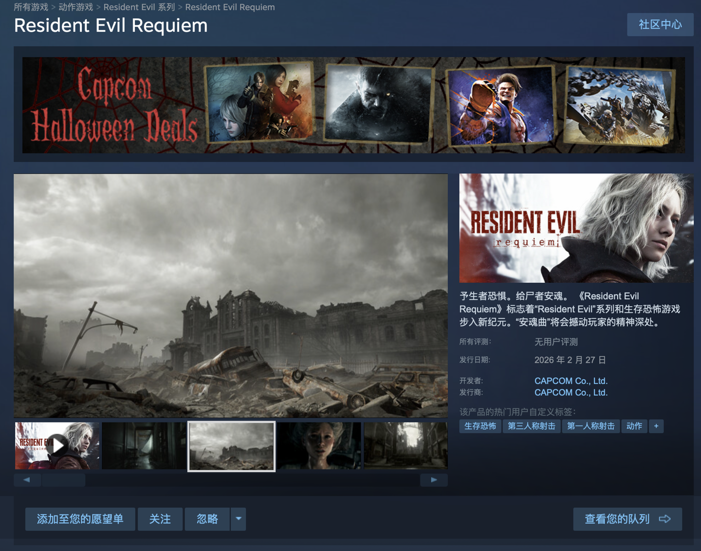 alixixi 10 月 31 日消息,卡普空《生化危机》系列主线第 9 部正统续作《生化危机:安魂曲》现已开启预购,本作将于 2026 年 2 月 27 日正式发售,游戏支持中文,在 Steam 国区标准版 348 元,豪华版 398 元,游戏商品页(https://store.steampowered.com/app/3764200/Resident_Evil_Requiem?snr=1_7_15__13)。