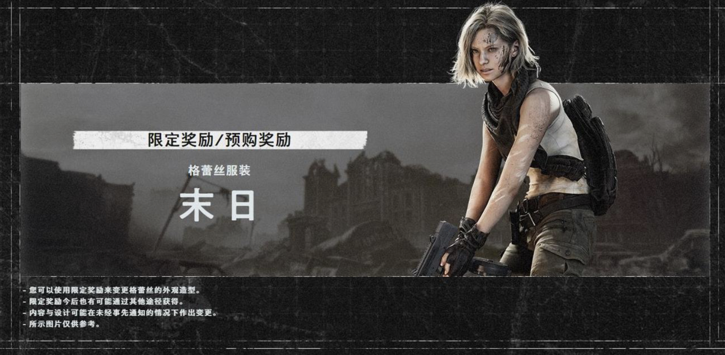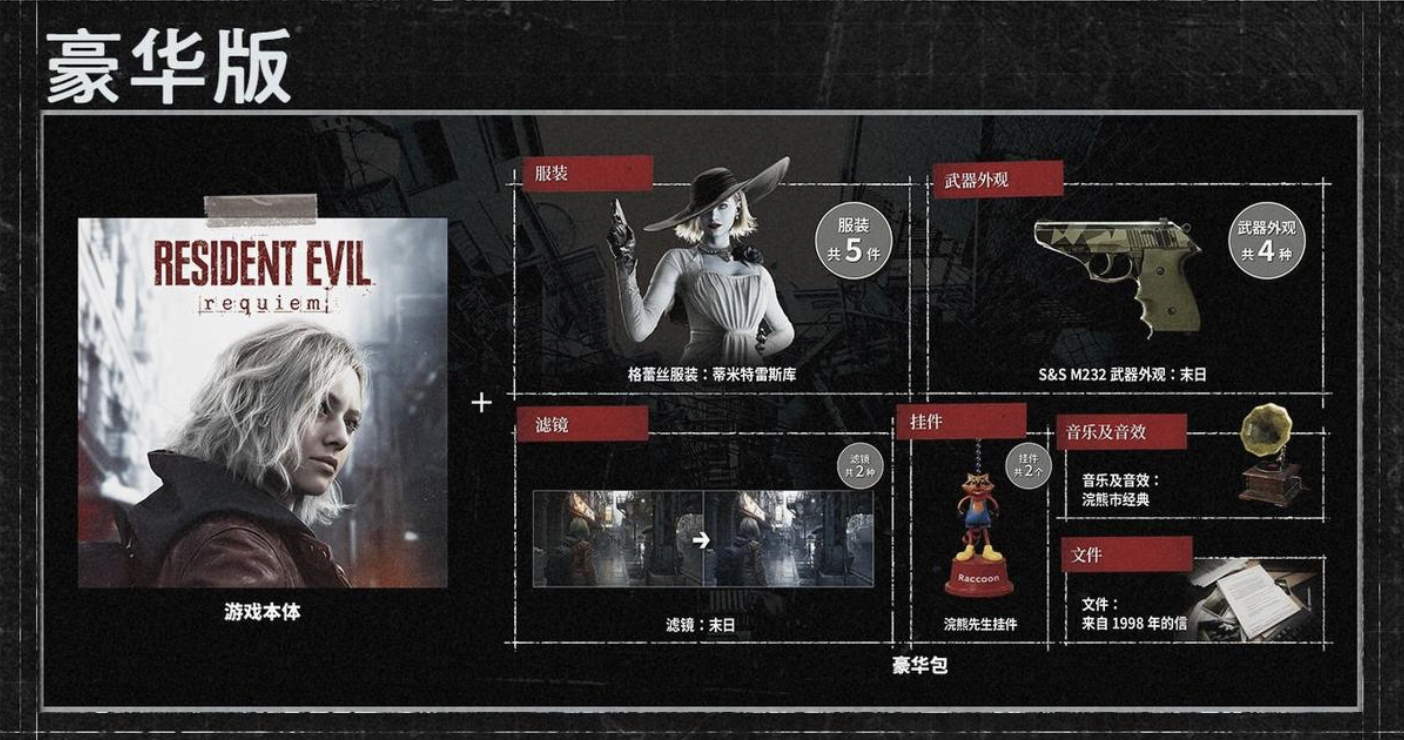 官方表示,游戏豪华版附带 5 套服装、2 款滤镜、4 款武器外观、2 款挂件、音乐及音效,以及文件“来自 1998 年的信”,预购游戏任何版本可获得限定特典“格蕾丝末日服装”。