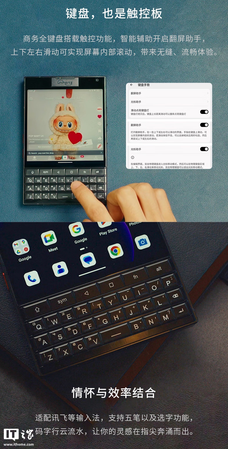 该机整体具有商务风格,整体重量 235 克,正面配备一块 4.5 英寸 1440x1440 分辨率面板,匹配 32MP 自拍摄像头。屏幕下方提供实体全键盘,相应键盘同时搭载触控功能,通过上下左右滑动可以实现屏幕内部滚动效果。