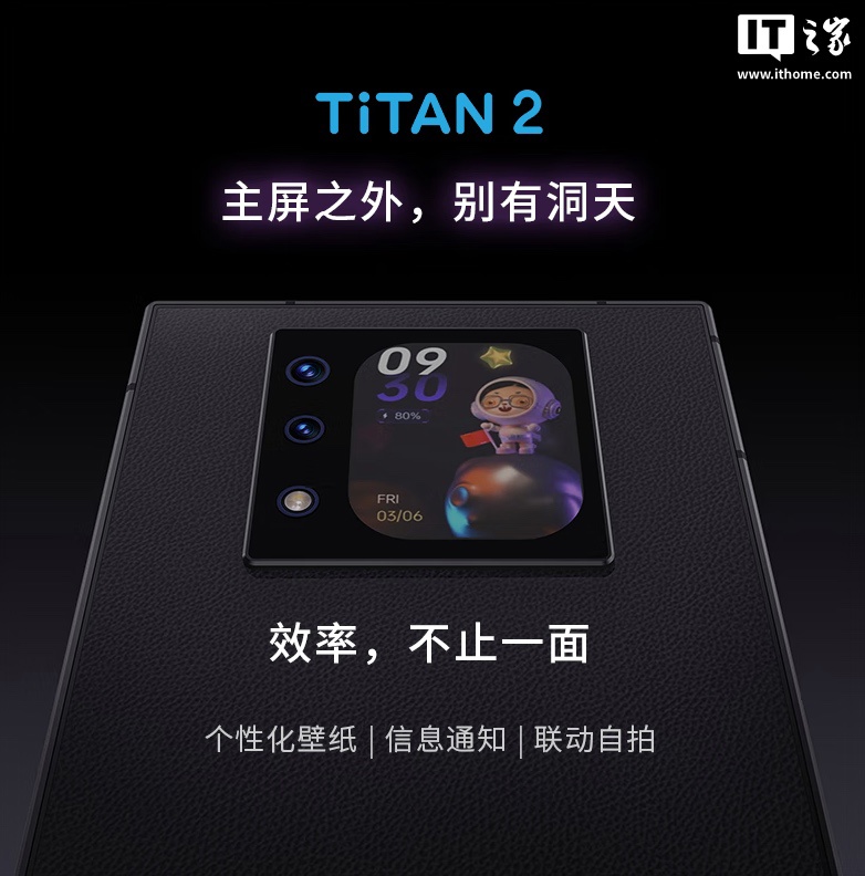 该机背面配备一块 2 英寸 140x502 分辨率面板,支持自定义壁纸,作为辅助自拍使用。提供 50MP 主摄和 8MP 长焦摄像头。