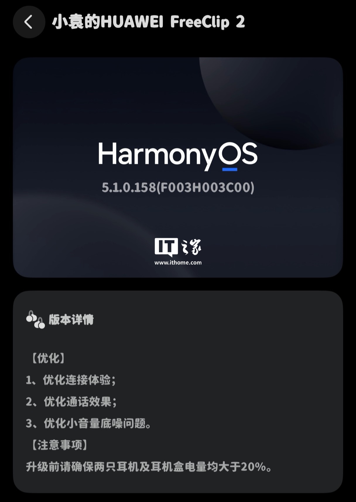 华为 FreeClip 2 耳夹式耳机已开启鸿蒙 HarmonyOS 5.1.0.158 版本升级,优化了小音量低噪等问题。alixixi附华为 FreeClip 2 耳夹耳机本次更新内容如下: