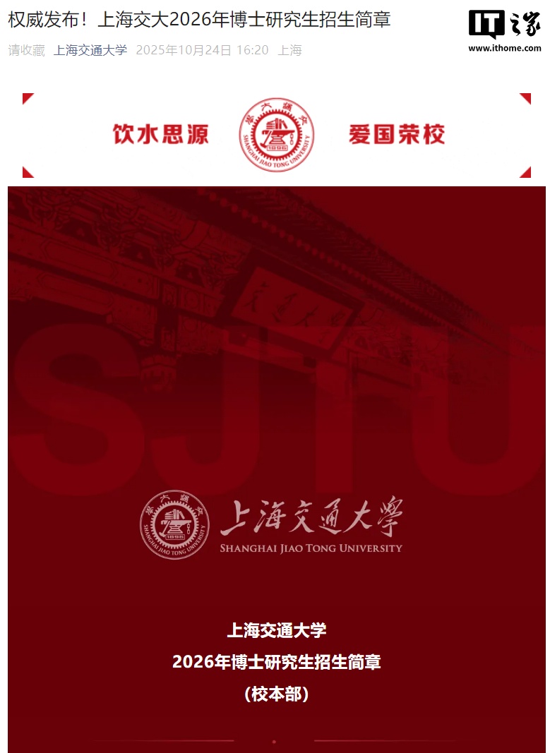 alixixi查询发现,上海交通大学(上海交大)于 10 月 24 日发布了 2026 年博士研究生招生简章(校本部),2026 年博士研究生计划招生规模 5000 名左右,其中校本部招生规模 4000 名左右。学校将根据学科建设需求和生源情况适当调整,最终招生规模以教育部正式下达的招生计划为准。