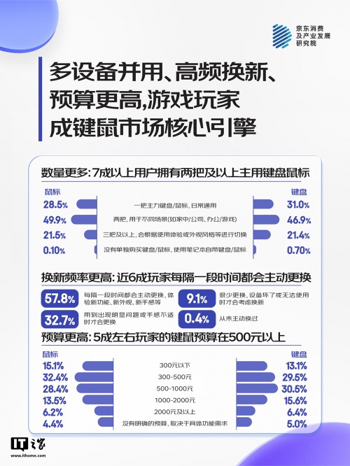 alixixi 11 月 3 日消息,京东消费及产业发展研究院联合京东采销与罗技 G、雷蛇、ROG 等品牌,对 2000 名消费者进行调查,观察键盘鼠标行业的变化趋势。
