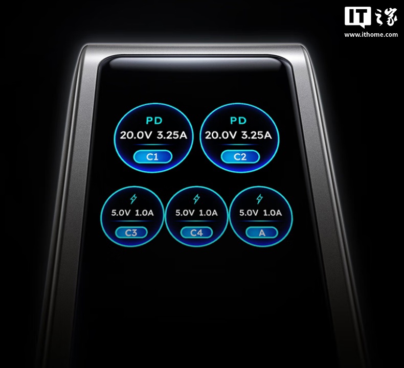 该机配备一块彩色面板,可显示充电协议 + 电流电压,例如给苹果 iPhone 充电时便会显示使用 PD 协议充电,同时每个充电接口也可独立显示实时输出功率。