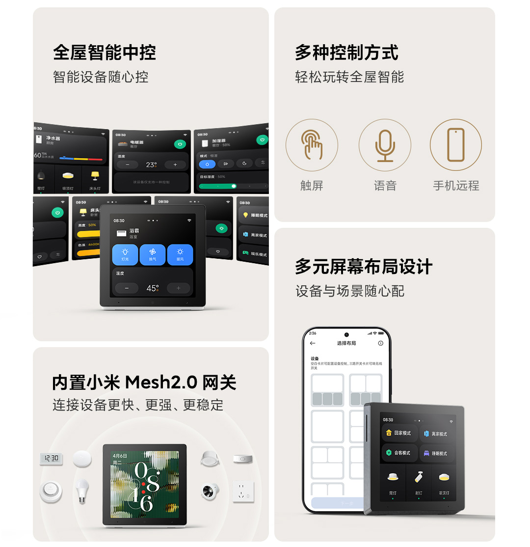 它还支持双频 WiFi,支持触屏、语音、手机远程多种控制方式,支持多种屏幕布局,快捷添加设备及场景。可将“回家模式”“睡眠模式”等入口设在首页,实现一键直达所需;采用高精度 24GHz 毫米波雷达;支持小米多种设备摄像头监控联动。