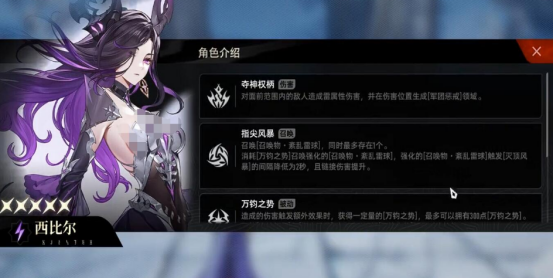 首先比较推荐的五星角色就是西比尔,属于雷属性角色,在整个队伍当中可担任主c位置,具有着较为出色的召唤能力,后在召唤的同时还有着出色的输出效果。有较为出色又别致的技能,比如夺神权柄,在搭配具有特色的指尖风暴以及大招,能够轻松扰乱敌人的战斗节奏,最终造成具有高伤害范围的雷电攻击。是此角色无论是在打击小怪还是在打击精英的时候,都表现得非常出色,全面提升具体的扩容率。此角色养成方法相对来说比较简单,成型比较早,对于资源依赖极低,即便没有复杂的配对,依旧能够享受极强的能力,是新手开荒的优质之选。