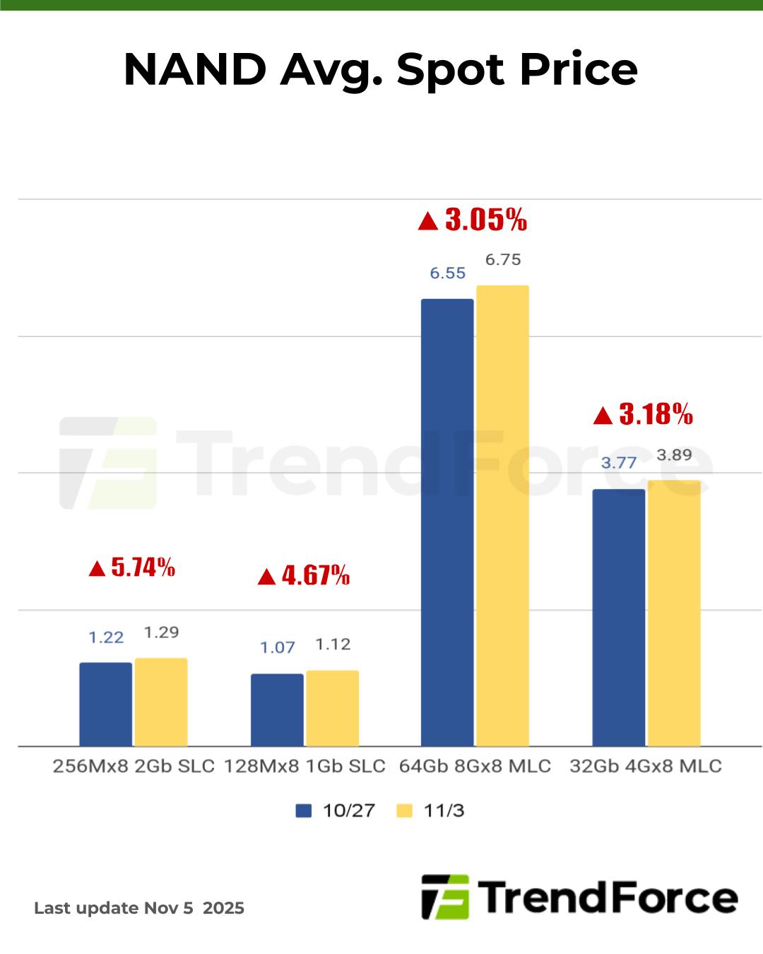 在 DRAM 领域,由于供应紧张,买家正疯狂囤货,一看到报价便立即下单,直接推动现货价格飙升。而在 NAND 闪存领域,供应商的惜售和控量策略,也导致市场交易零星,价格持续走高。