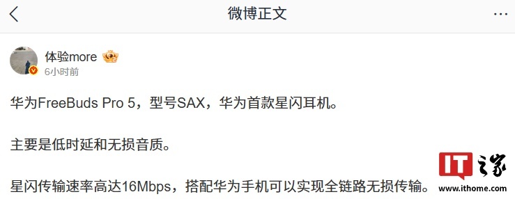 alixixi 11 月 6 日消息,华为终端 BG 首席执行官何刚今日宣布:全球首款支持星闪音频技术的无线耳机 —— 华为 FreeBuds Pro 5 悦彰耳机本月将和大家见面。