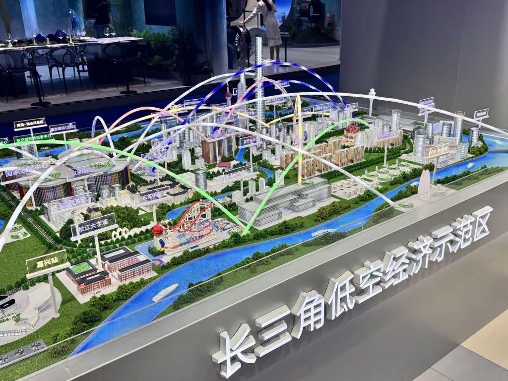 购票完成后,观众还可以通过起降点设置的安检出入口、航班信息屏、候机休闲区、停机坪、低空经济示范区沙盘等多个区域,近距离了解起降点的运行机制,并亲眼看到未来空中交通的城市网络布局。“低空经济示范区沙盘”以长三角区域为蓝本,展示了城市、城际间空中交通网络及节点分布,既呈现了不同航线的功能定位,还标识了构想中未来的起降点分布。