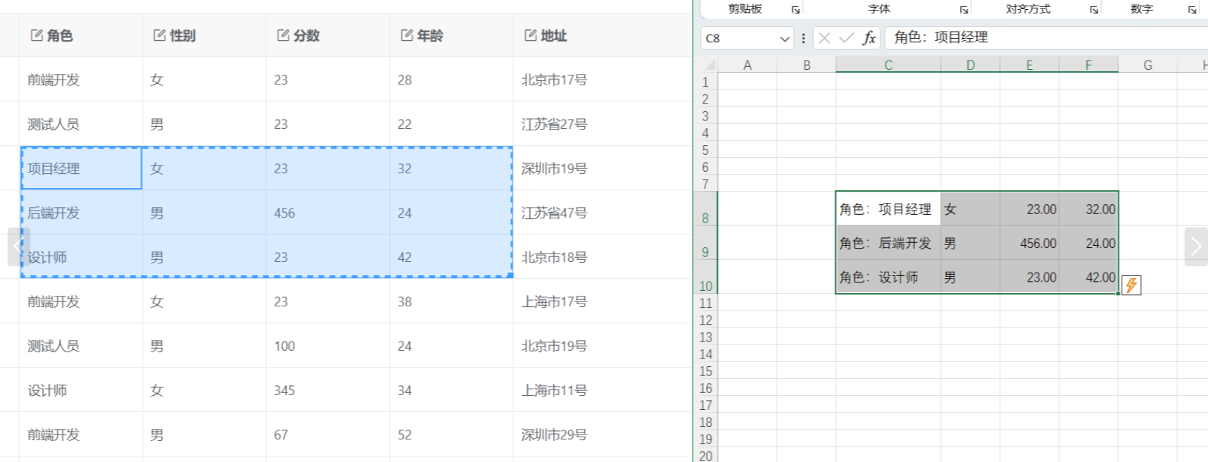 默认情况下是复制对应 field 字段值,当需要对特定字段进行格式化或自定义时,就可以通过 copyMethod、pasteMethod 配置可以精确控制复制粘贴的所有行为以及自定义复制粘贴的逻辑控制。比如需要控制某个单元格复制后的值,本来是下拉框的键值,要转成实际值复制到 excel,这时候就可以使用该转换函数了