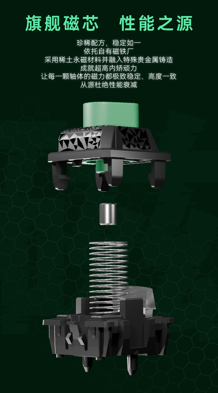 佳达隆三角磁轴具备短行程 + 高回弹的特性,配备高内矫顽力磁芯,上盖和底座均采用哑光黑改型 POM 材料,上部装饰以三角矩阵暗夜图腾纹路,底部为封底发声结构,导光柱可独立拆卸。