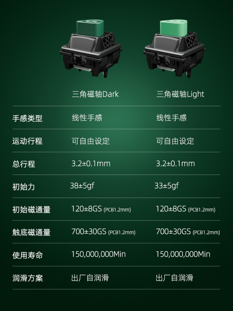 这款轴体包含轻压力(初始 33±5gf)的 Light 和重压力(初始 38±5gf)的 Dark 两个版本,使用寿命均至少可达 1.5 亿次击键。