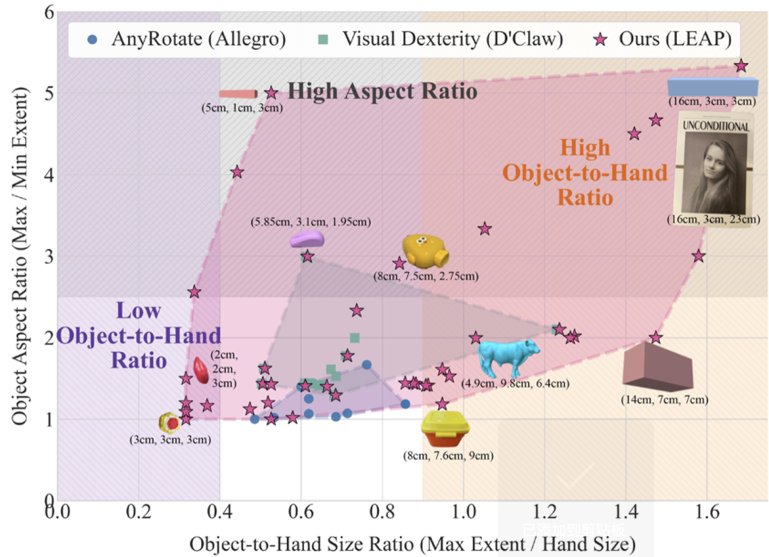 在这些方法中,我们可以窥见,当前的手内操作方法往往局限于特定场景(如固定手腕朝向)、只能处理有限集合的常规物体,或依赖昂贵、定制化硬件。即便在单一维度(如旋转轴)上实现了通用性,仍难以在多维操作中保持稳定表现。
