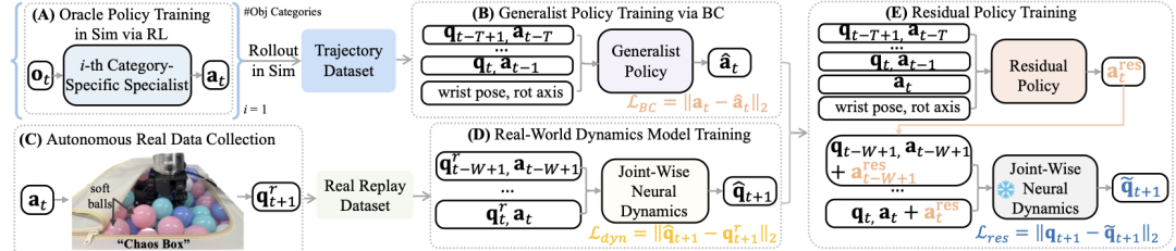基于此,研究者进一步训练了一个残差策略网络,用于弥合仿真到现实的差距,使仿真中学到的基础策略能够顺利迁移到真实世界。