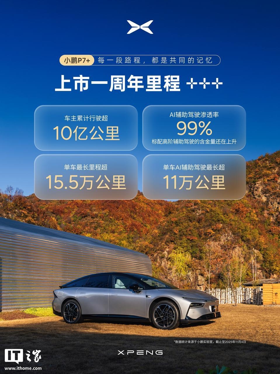 alixixi 11 月 10 日消息,小鹏汽车官方今日宣布:小鹏 P7+ 累计交付已超过 8.5 万台,连续 11 个月 15-20 万级中大型纯电轿车销量 TOP1。