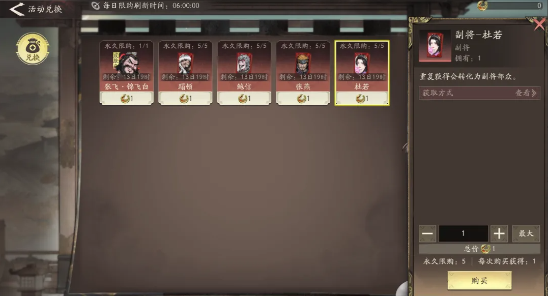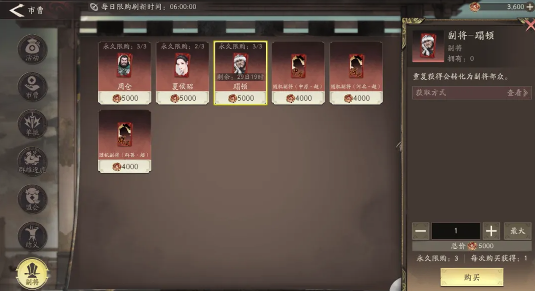 蹋顿获取方式目前有两种,一种时通过江亭取物活动抽奖,拿到指定代币、在活动商店兑换,另一种是在副将商店,使用副将币兑换(感觉副将商店还是兑换专属副将好一点)。