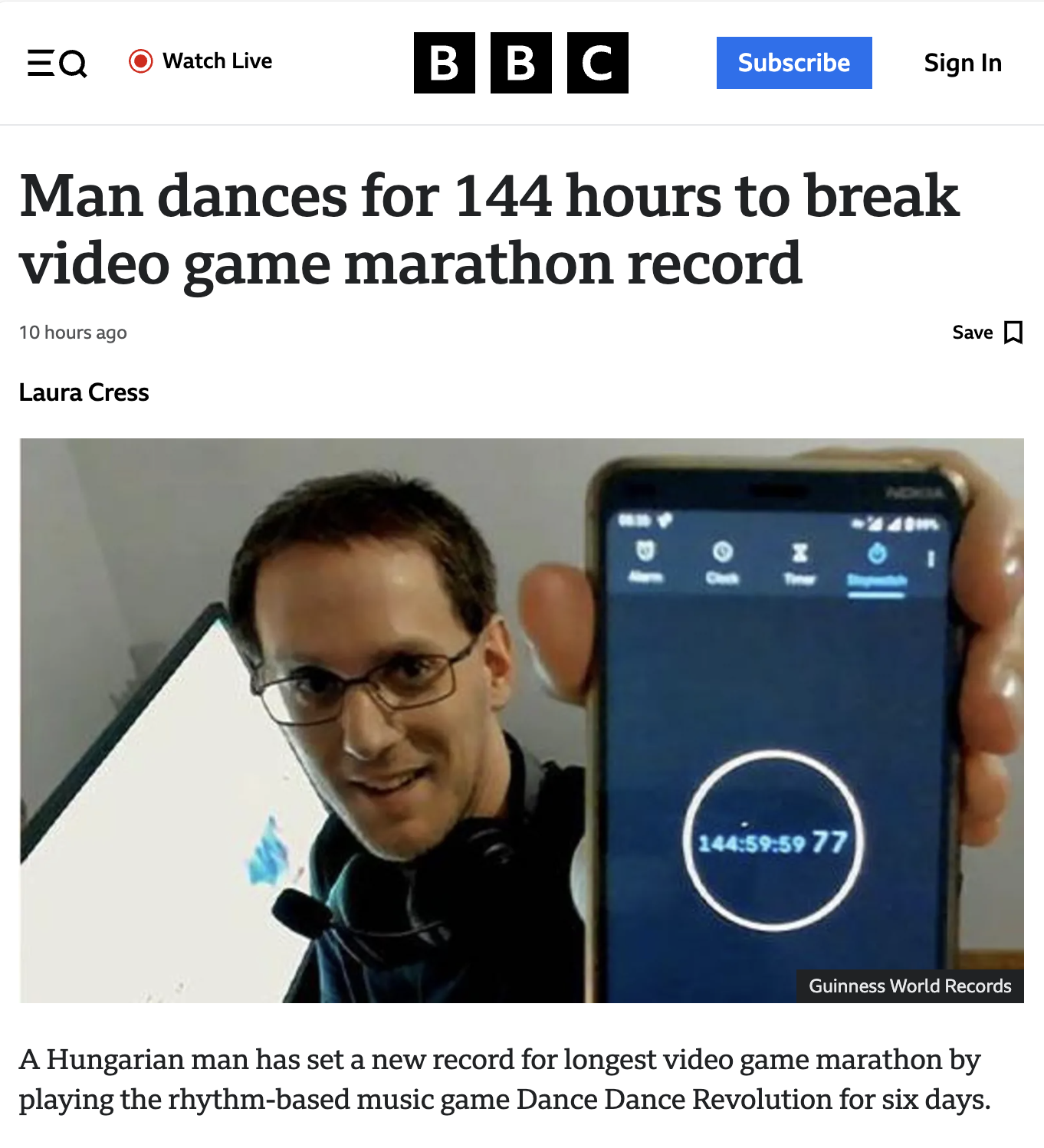 萨博尔茨・切佩在接受 BBC 新闻采访时表示:“玩《劲舞革命》对我来说总是充满乐趣,所以这次挑战可以用‘累并快乐着’来形容。”他的这一壮举已获得吉尼斯世界纪录的正式认证。