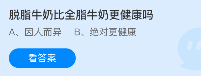 脱脂牛奶比全脂牛奶更健康吗?支付宝小鸡课堂开课啦!每天花一分钟答题赚饲料,喂喂小鸡就能贡献爱心啦!轻松又意义十足!2025年11月13日蚂蚁庄园的小鸡课堂题目正确答案是【因人而异】,脱脂牛奶和全脂牛奶各有利弊。脱脂牛奶适合减肥或患有慢性病的人群以及老年人引用。全脂牛奶大部分人群均可饮用,尤其是青少年,全脂牛奶能够提供他们成长过程中所需的丰富营养。