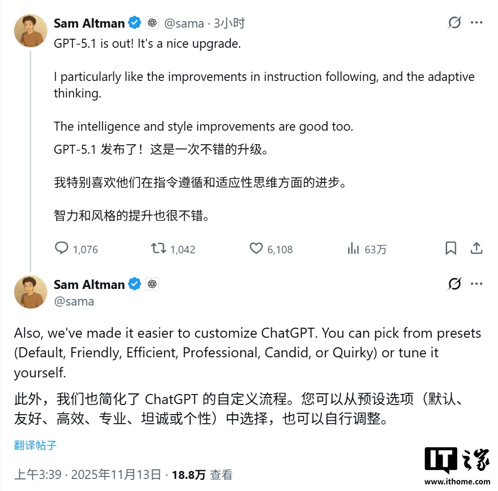 alixixi 11 月 13 日消息,OpenAI 今天(11 月 13 日)发布公告,宣布推出 GPT-5.1 系列旗舰模型,官方声称此次升级旨在“让 ChatGPT 更智能,对话体验更有趣”。新版本将从本周开始向用户推送,而旧的 GPT-5 模型将在三个月后被彻底取代。