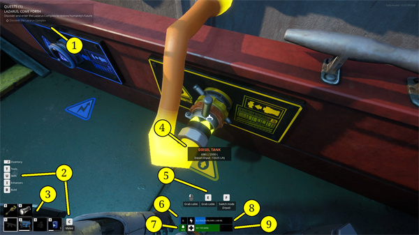 8、电量:底部的长蓝条显示你的电池电量。如果电量耗尽为0,你将开始失去生命值,直到充电。电池电量是大多数动作所必需的,即使静止不动,也会慢慢消耗。