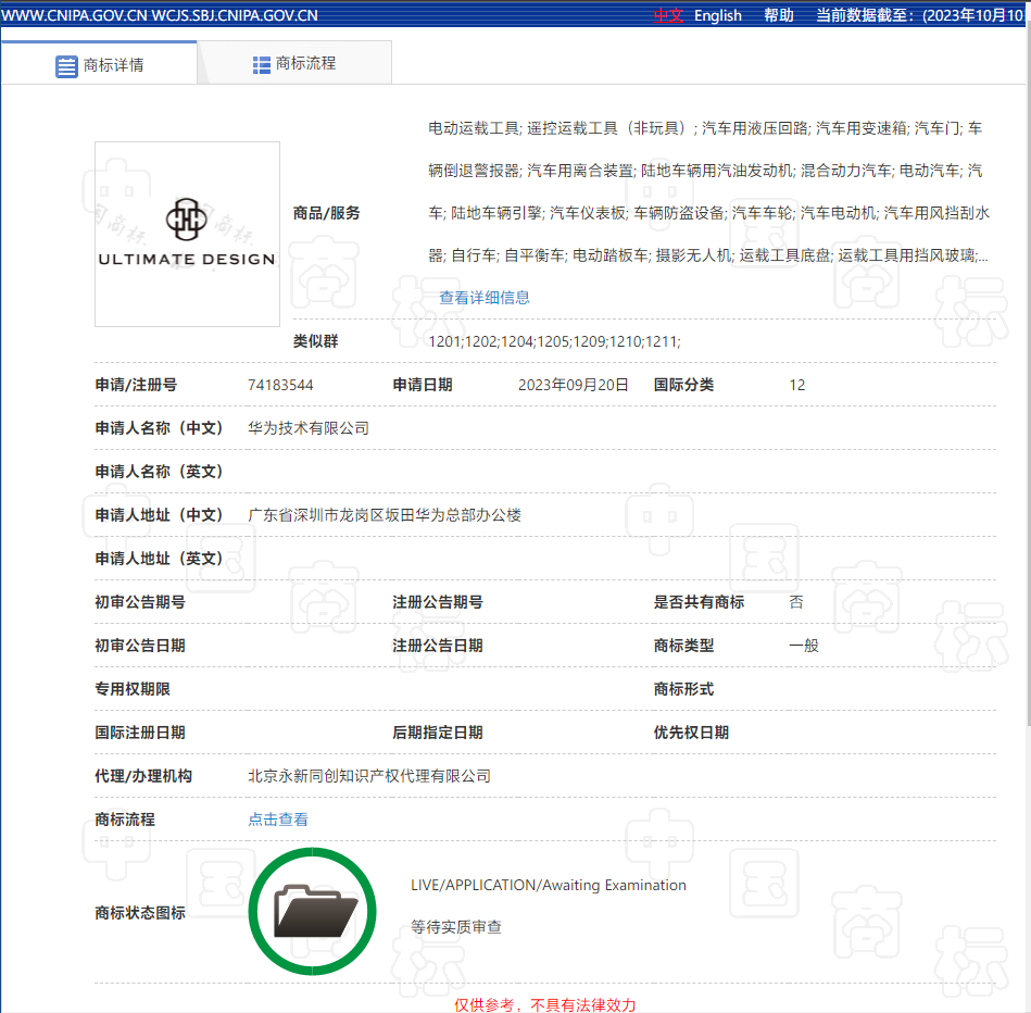 alixixi查询获悉,早在 2023 年,华为技术有限公司就已经申请类别为“运输工具”的“ULTIMATE DESIGN”(非凡大师)商标。