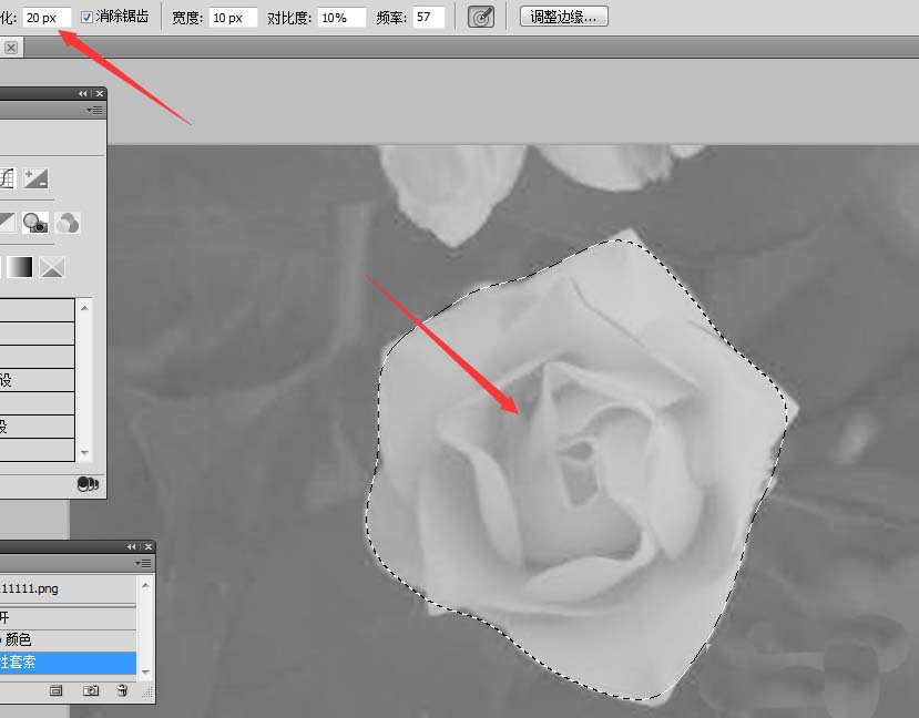 6、小心地将花朵抠出来,现在颜色差距很多,非常简单。适当地羽化值为5左右。(图中羽毛20有点大)