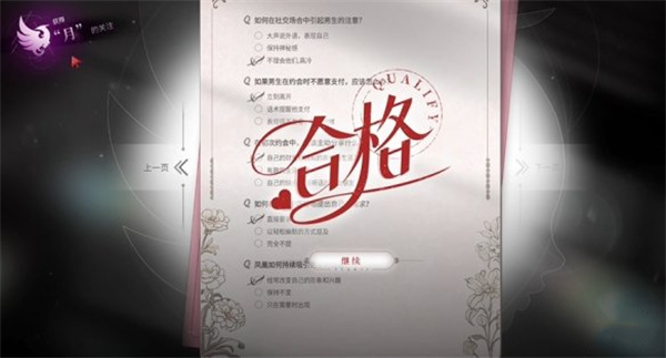这里的两个选项和答题都要根据何月盈的人设来选,以获取他的关注。选对了左上角会出现月的标识。