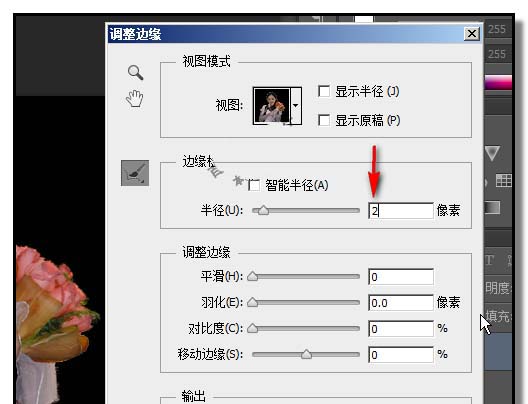 6、我们在操作框的“半径”这里,设置为2像素,图片所抠边缘有了明显的变化,如下图所示。