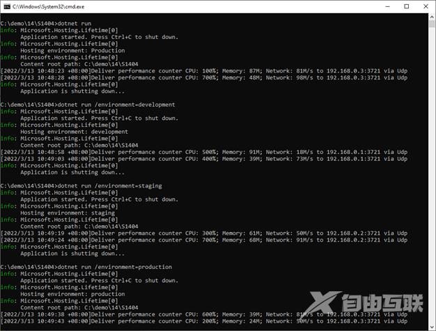 由于我们在调用Host的CreateDefaultBuilder方法时传入了命令行参数(args),所以默认创建的IHostBuilder会将其作为配置源。也正因为如此,我们可以采用命令行参数的形式设置当前的承载环境(对应配置名称为“environment”)。如图4所示,我们分别指定不同的承载环境先后四次运行我们的程序,从输出的IP地址可以看出,应用程序确实是根据当前承载环境加载对应的配置文件的。输出结果还体现了另一个细节,那就是默认采用的是产品(Production)环境。