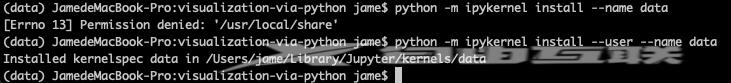 执行python -m ipykernel install --name data后,出现[Errno 13] Permission denied: '/usr/local/share',则可以将名利修改为: