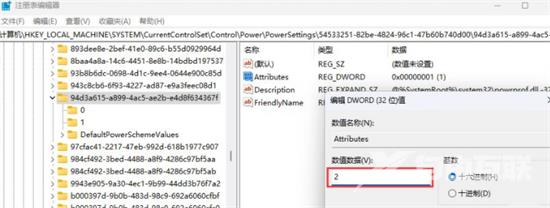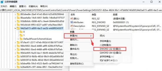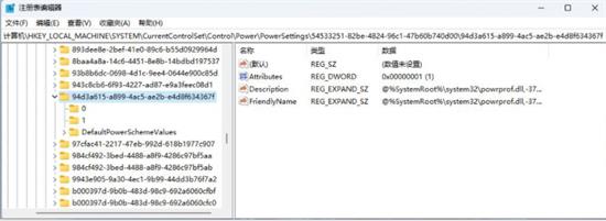 4、注册表编辑器窗口,依次展开到以下路径:HKEY_LOCAL_MACHINESYSTEMCurrentControlSetControlPowerPowerSettings54533251-82be-4824-96c1-47b60b740d0094D3A615-A899-4AC5-AE2B-E4D8F634367F。