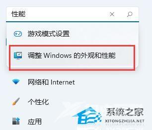 3、然后再左上角搜索“性能”,进入“调整Windows的外观和性能”。