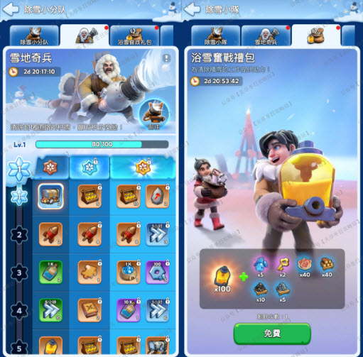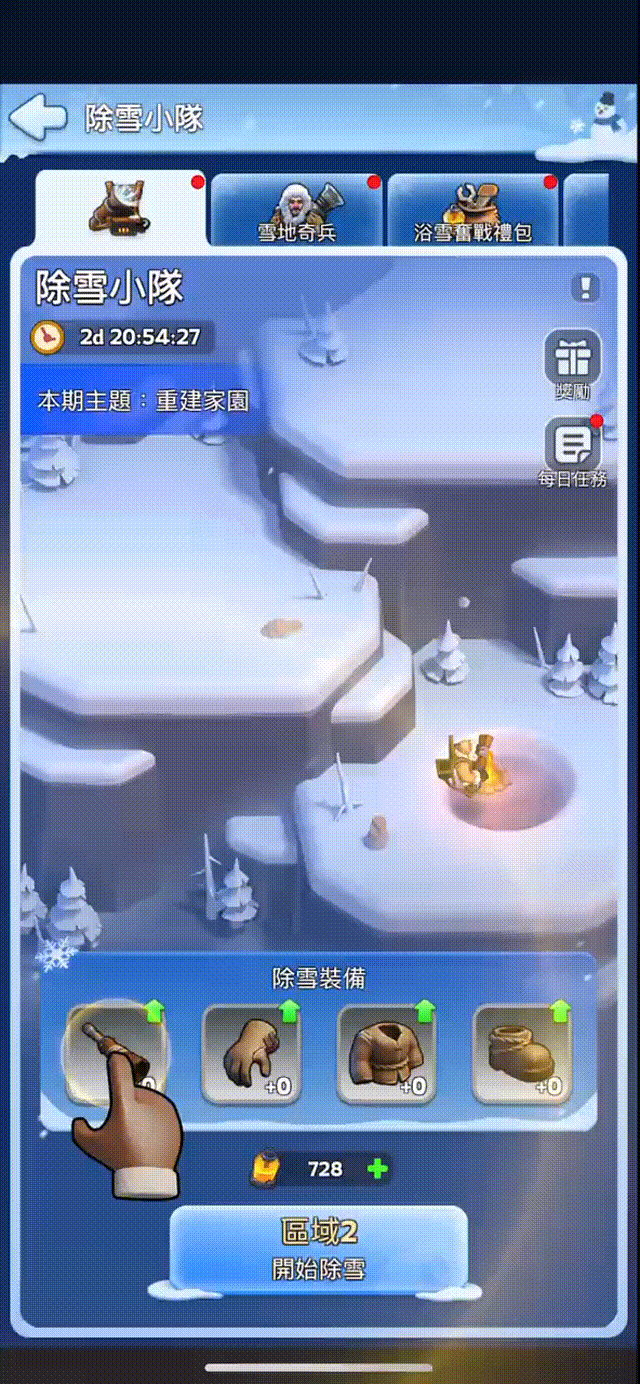 2、相对应的会有除雪装备升级(类似英雄装备,主要用来增加铲雪的效率)-除雪背包(道具存放)