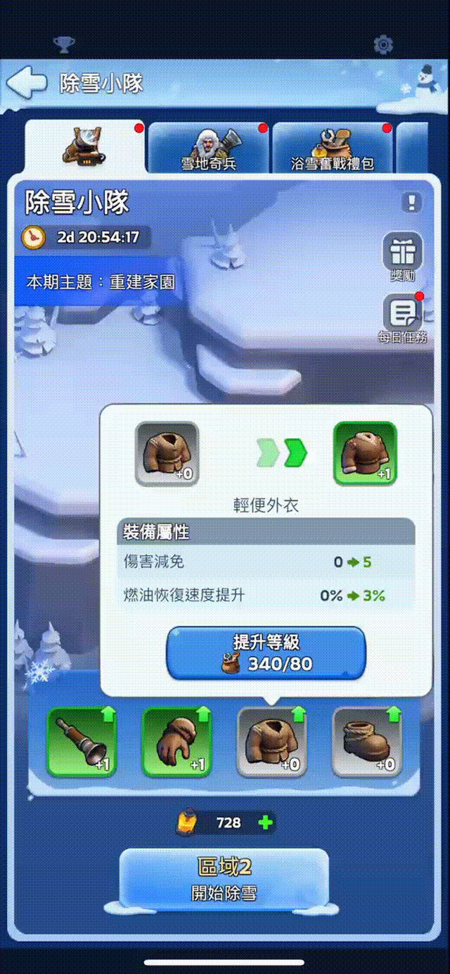 1、通过消耗道具,去升级除雪装备材料道具,升级装备可以提升不同的除雪属性;能够帮助更快除雪和恢复燃油;越往后的关数,道具升级越关键;(装备的提升应该也会有前后优先级顺序)