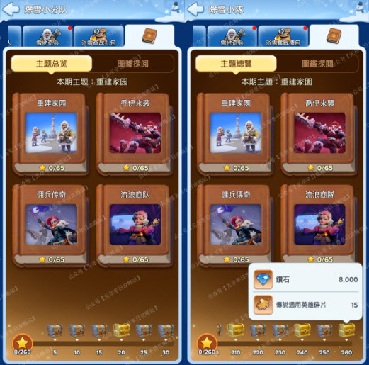 1、解锁对应的图鉴会有全新的行军皮肤和城堡皮肤;四个主题的图鉴分别对应的城堡皮肤,行军皮肤,头像框和铭牌奖励;