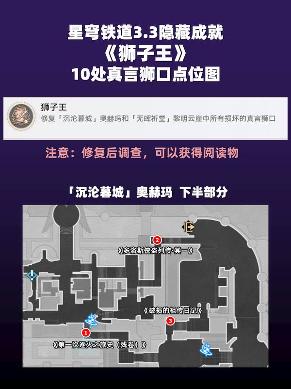 崩坏星穹铁道3.3版本新增隐藏成就狮子王,需要修复沦陷奥赫玛和黎明云崖的所有真言狮口才能获得,很多小伙伴可能都没找齐,那今天小编就为大家展示这些真言狮口具体怎么找,没找齐的小伙伴赶紧来查漏补缺吧!