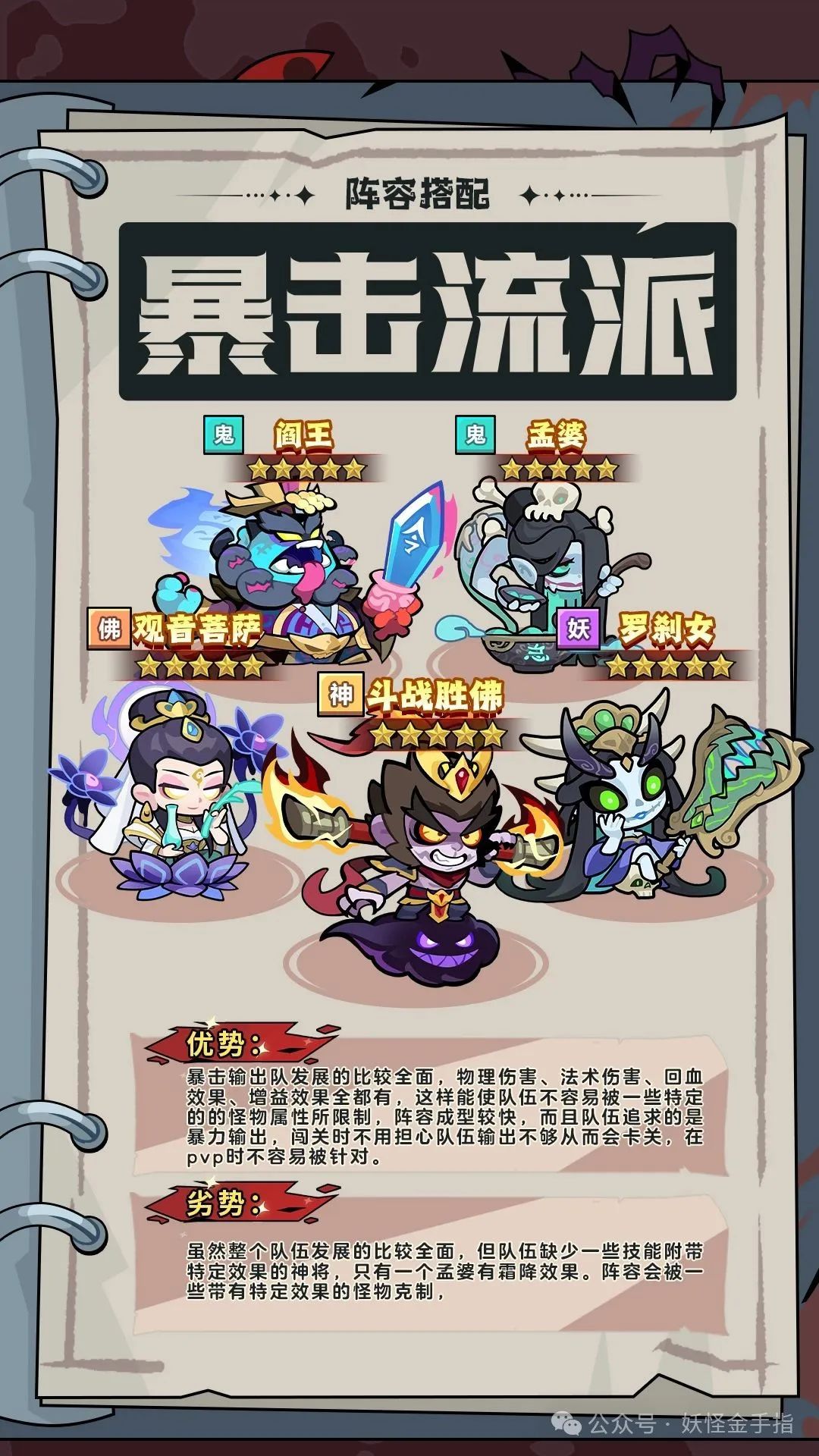 优势:暴击输出队发展的比较全面,物理伤害、法术伤害、回血效果、增益效果全都有,这样能使队伍不容易被一些特定的的怪物属性所限制,阵容成型较快,而且队伍追求的是暴力输出,闯关时不用担心队伍输出不够从而会卡关,在pvp时不容易被针对。