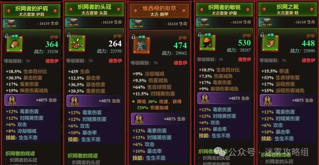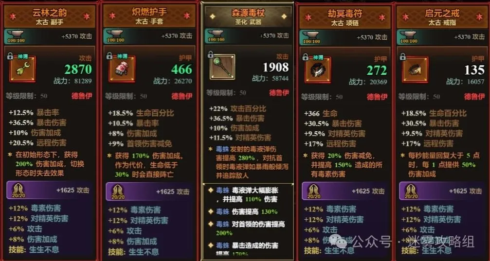 织网者四件套(随意部位都可),神铸技能生生不息(精英伤高于多少有伤害加成),圣化武器森源毒杖(毒液弹加伤),圣化技能5毒蛛,副手前期云林或者万兽都可以(后期得森罗),胸甲维西娅的献祭(降攻速加伤害),戒指启元(伤害加成),项链劫冥毒符(加毒素伤害)!