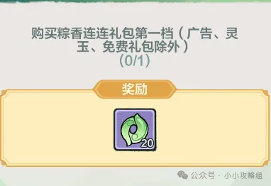 该板块就是一些任务,都很简单,完成即可获得对应灵玉、宝箱、加速券……全部完成后可以获得一个武器皮肤+100星玉+20招募券。但0氪大侠是全部完不成的,因为里面有一个任务需要:购买粽香连连礼包第一档(除广告、灵玉、免费礼包外)!也就是说至少得氪6元?看各位大侠自己的选择吧!