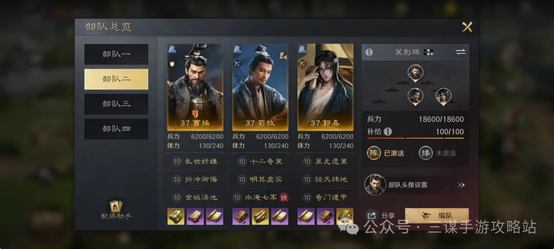 优点:和三仙带的战法完全一样,开荒的时候一般比较缺铜币,这队可以复用战法,同步开荒。