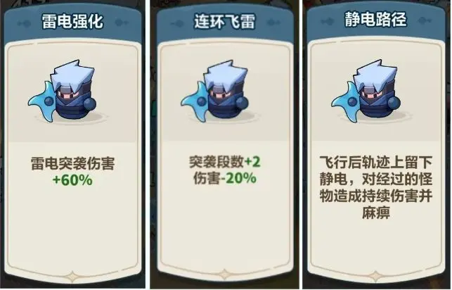 强化词条推荐选择【雷电强化】【连环飞雷】【静电路径】,增加伤害力,段数增加攻击距离,路径补充麻痹控制,提高卡卡AOE输出能力。