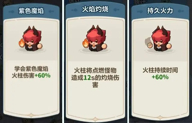 火焰法师主推荐选择【增伤】【灼烧】【持续时间】,增强法师持续伤害力。