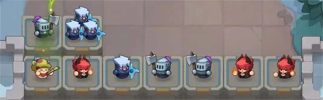 第4波来临前快速合成场上蘑菇头,增加战士/法师数量,可保留0~1个,主使用战士、法师去针对红心皇后和双头绿皮。