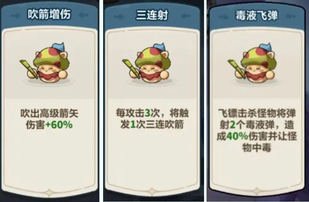 蘑菇头作为次输出伤害,强化词条选择【增伤】【攻击次数增加】【毒液飞弹】,提高吹箭攻击伤害和攻击速度,引爆更多毒蘑菇。