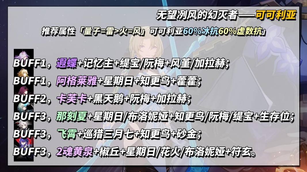 优势属性「量子=雷>火=风」,敌方特殊抗性「可可利亚60%冰抗60%虚数抗」非必要不考虑冰和虚数属性输出角色。