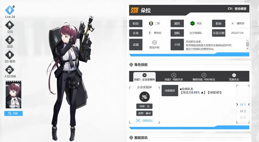 丽塔 :SSR 级辅助角色,冲锋枪持续输出,提供全队攻击加成与群体治疗,弹药量与换弹速度出色,泛用性强,适用于主线推图、防守战、高难副本等多种场景,是开荒与高难本必备角色,被称为 “人权卡”,开服首抽必争。
