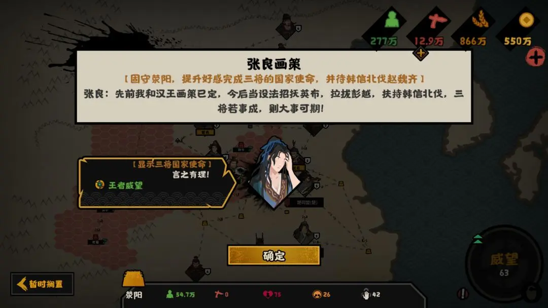 在这一阶段,我们先提高韩信、英布、彭越的好感,完成对应的国家使命任务,触发事件【韩信北征】,通过剧情事件,接连运筹帷幄吞并掉魏、赵,接着触发新的国家使命任务【攻占南阳】