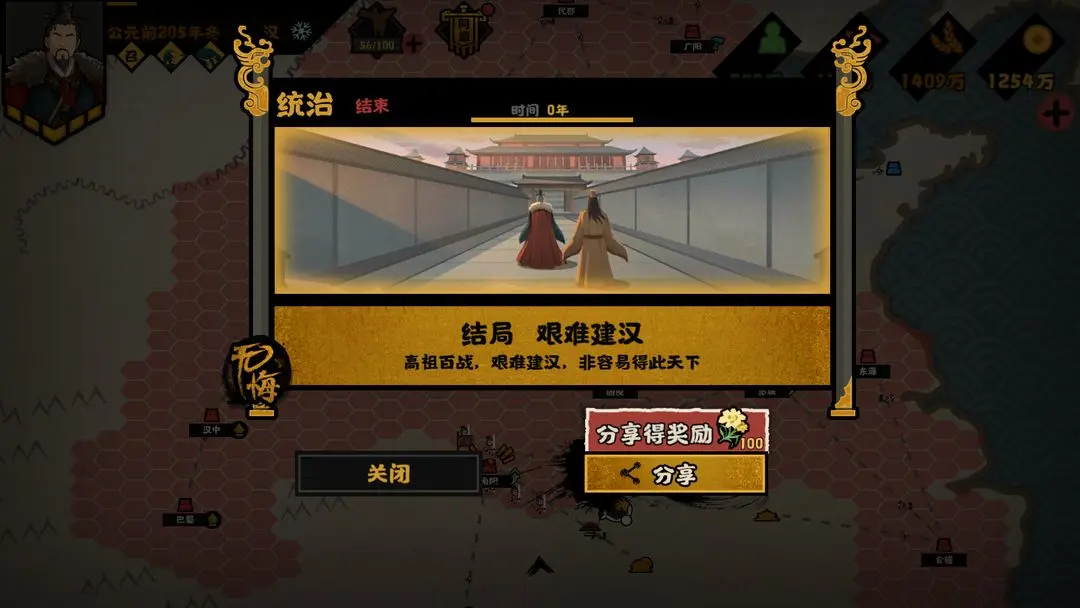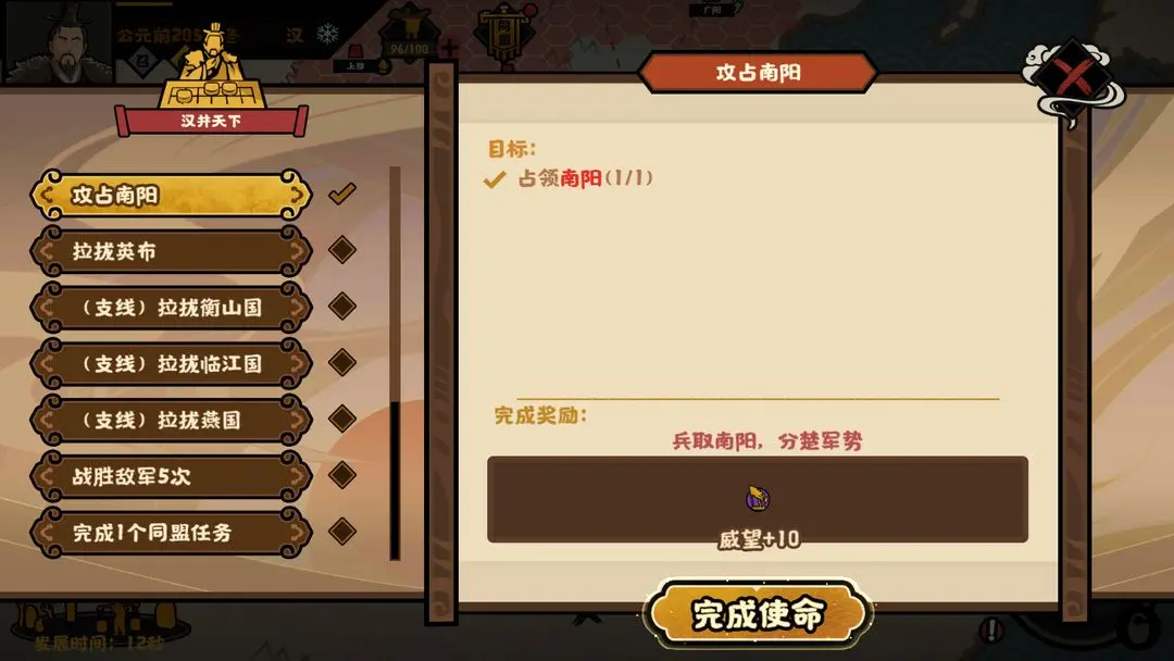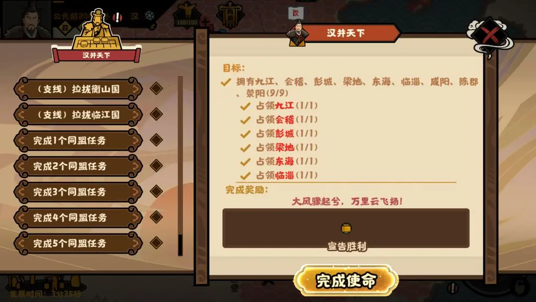后续,通过【伪游云梦】、【彭越之难】、【英布反叛】剧情事件与剧情战斗,分别运筹帷幄吞并灭掉韩信、彭越、英布,即可达成终局国家使命任务【汉并天下】