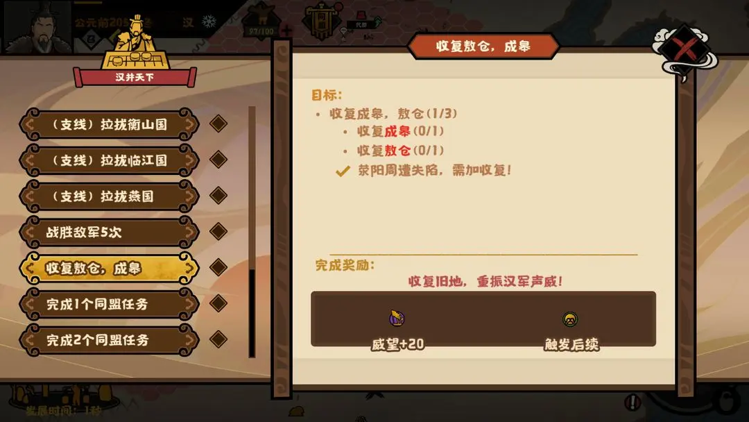 攻占敖仓,成皋,完成国家使命【收复敖仓、成皋】后,触发韩信北伐后续事件【韩信伐齐】。通过剧情运筹帷幄吞并掉齐国后,触发事件【楚汉对峙】与新的国家使命任务【坚守荥阳】